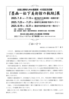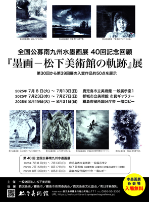 全国公募南九州水墨画展40回記念回顧 『墨画-松下美術館の軌跡』展 一般財団法人松下美術館主催「全国公募南九州水墨画展」が第40回を迎えるにあたり、これを記念して「全国公募南九州水墨画展 40回記念回顧『墨画 ― 松下美術館の軌跡』展」を開催する運びとなりました。 南九州水墨画展は、水墨画の普及と発展を目的に、昭和62年に第1回展を開催し、これまで全国公募の展覧会として独自の視点をもって歩みを続けてまいりました。回を追うごとに内容も充実し、多くの皆様にご来場いただいております。 今回の40回記念展では、第30回から第39回展までの入賞者の中から、趣旨にご賛同いただいた方々の作品に加え、長年に亘り本展にご尽力いただいている4名の特別功労賞受賞者の作品、そして、本展開始当初より審査員を務めていただき、昨年逝去された芝龍郎先生の遺作と、水墨画家 今岡琴子先生、現代水墨画家 大谷喜郎先生による審査員特別出品作品も合わせて、計52名・53点の作品を展示しております。 青森県から鹿児島県まで、日本各地からご出品いただき、また、今回は初めて都城市立美術館へ巡回も実現いたします。南九州水墨画展がこれまで発信してまいりました水墨画の魅力と、受賞作家たちの多彩な表現を、改めてご覧いただく機会となりましたら幸いに存じます。 今後も、この南九州水墨画展が皆様の一層のご活躍の場となりますよう、水墨画の魅力を伝えるとともに、その振興に努めてまいります。 最後になりましたが、本展の開催にあたり、多大なるご支援・ご協力を賜りました皆様に、心より御礼申し上げます。 令和7年7月8日 一般財団法人 松下美術館 館長 松下兼介 |