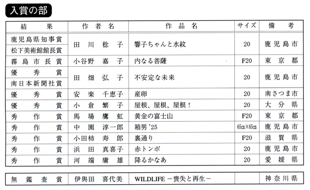 第40回 全国公募南九州水墨画展 第40回全国公募南九州水墨画展は令和7年6月22日に審査を行い、下記の方々が入賞されました。 入賞作品はこちらからご覧いただけます。⇒ こちら |